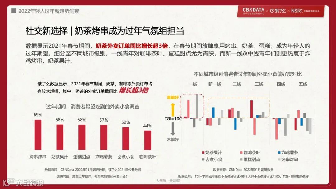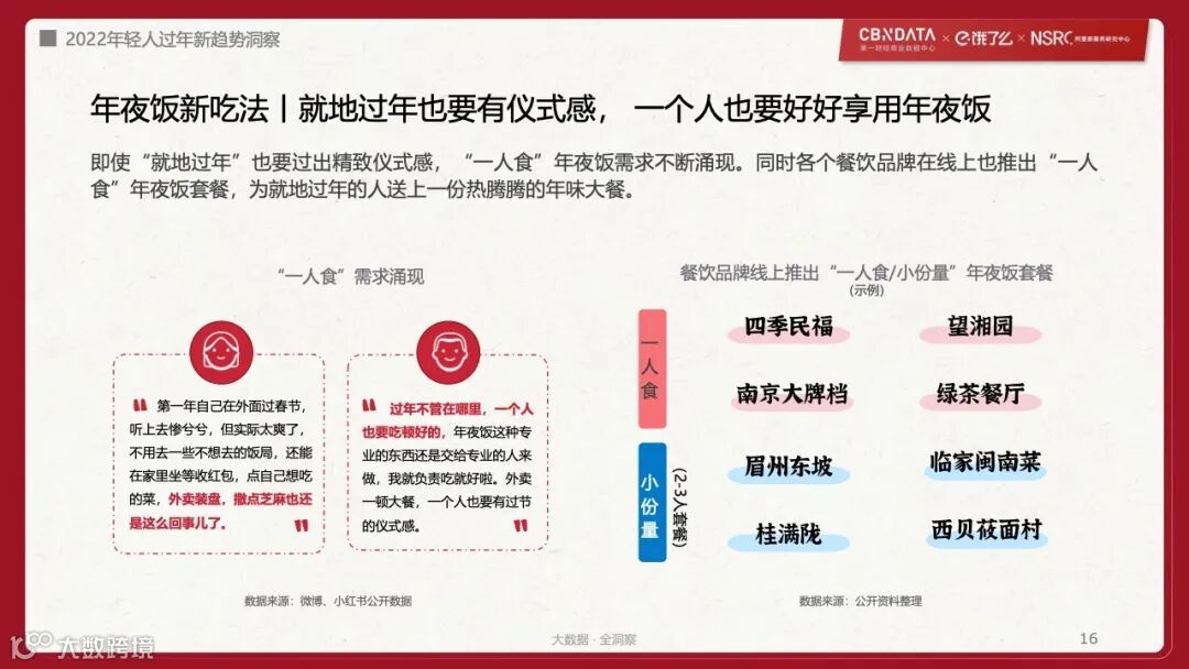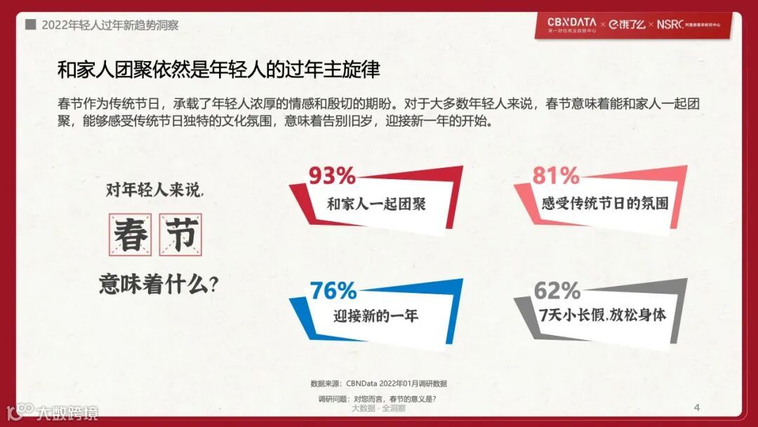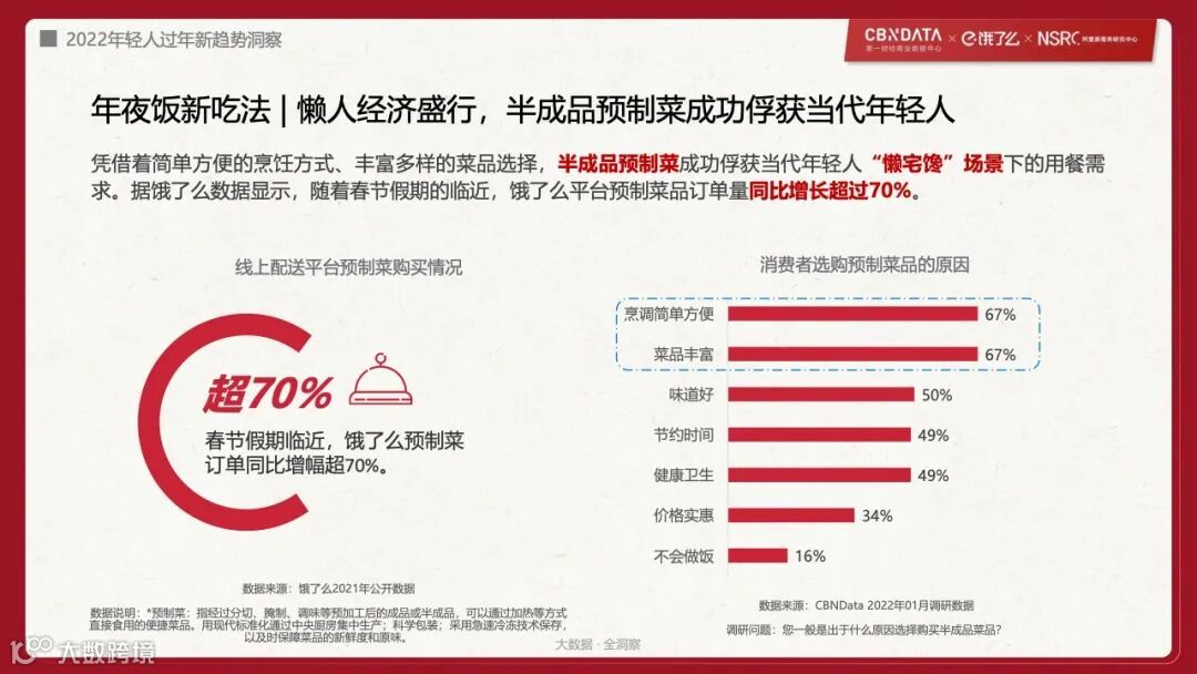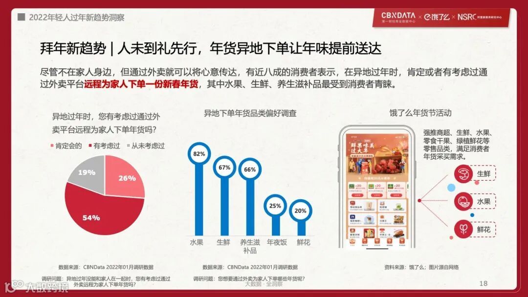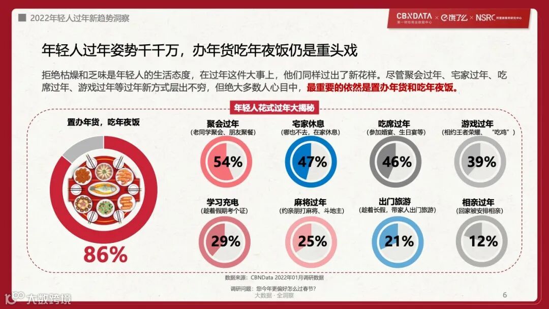 第一财经商业数据中心(CBNData)联合饿了么市场营销及品牌合作业务中心、阿里新服务研究中心共同发布《2022年轻人过年新趋势洞察》报告。呈现当代年轻人接过“年货采办权”后的过年新趋势新场景,包括年货新消费、年夜饭新吃法、拜年新趋势、社交新选择等。