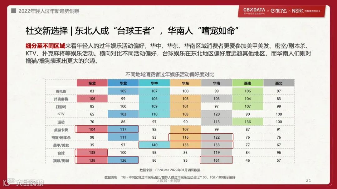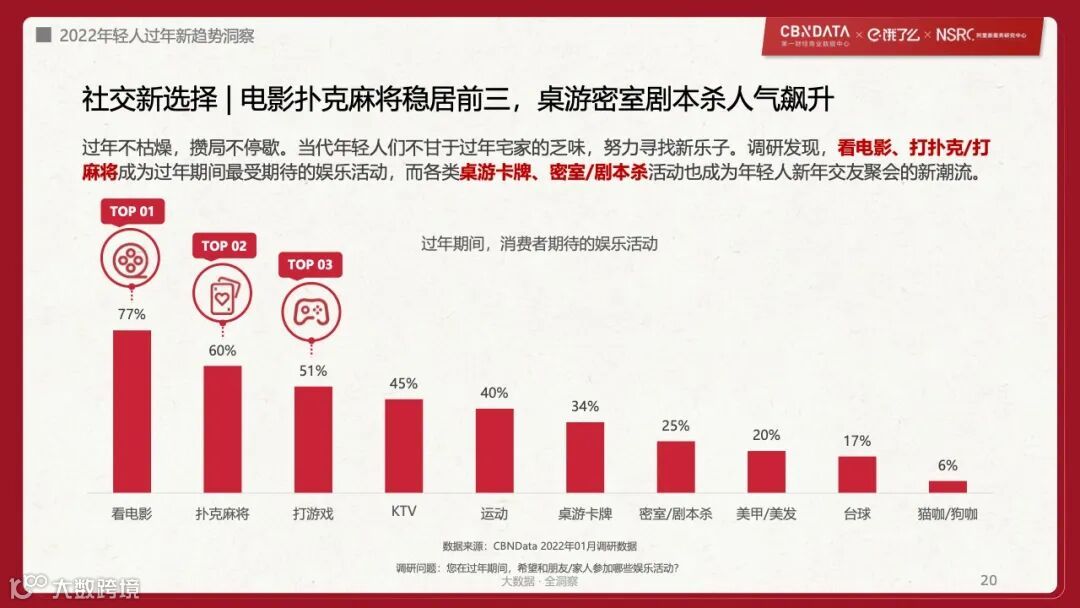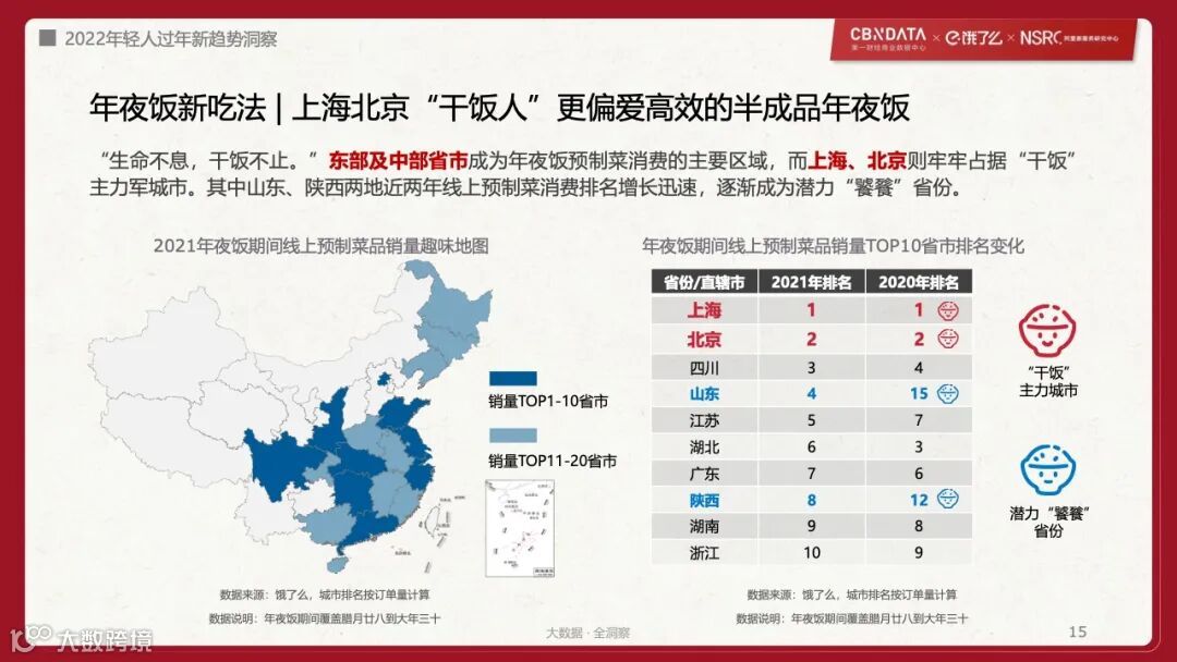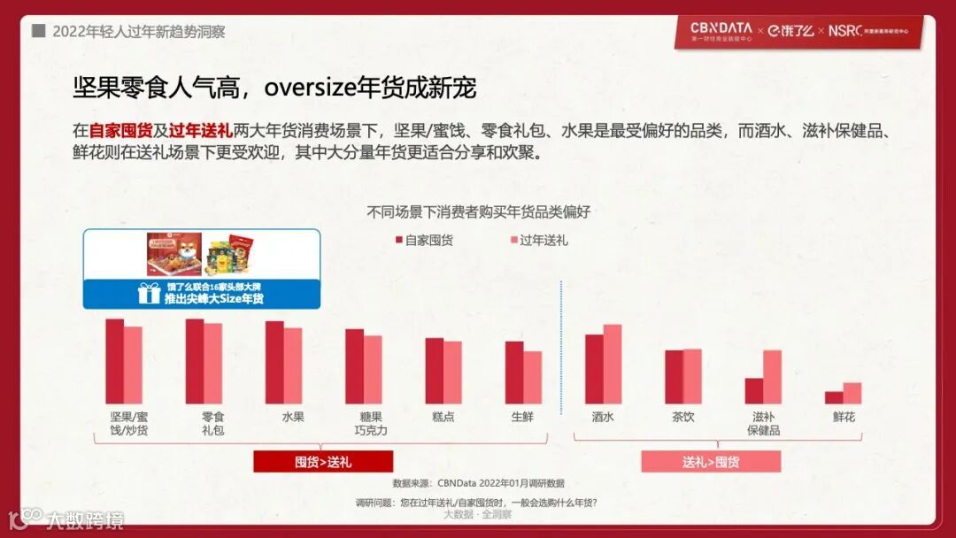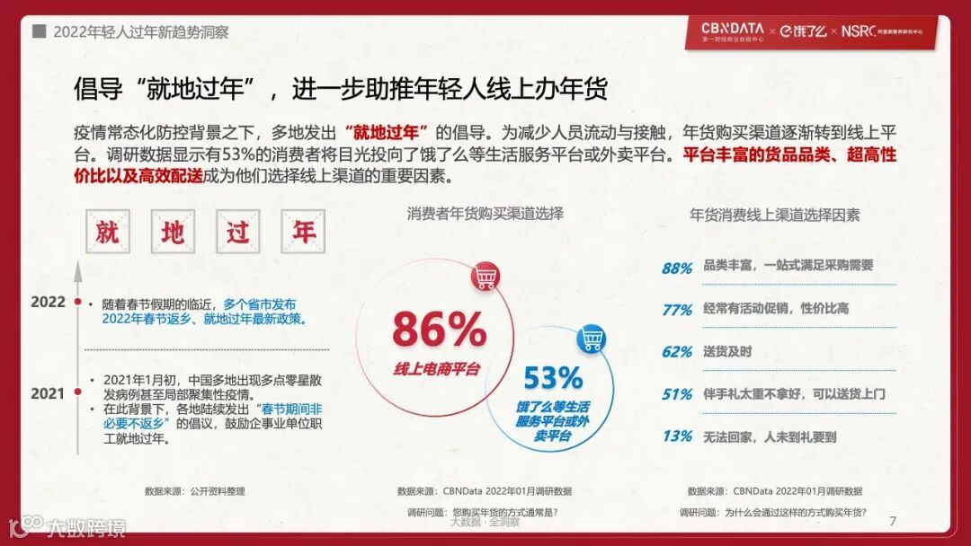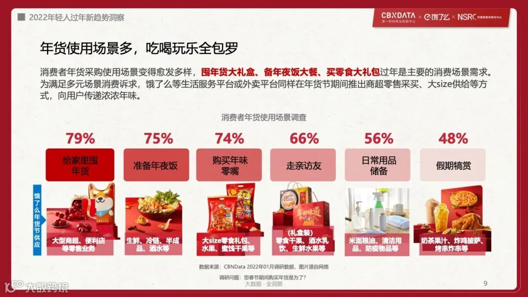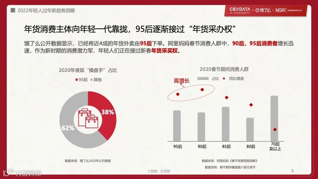 第一财经商业数据中心(CBNData)联合饿了么市场营销及品牌合作业务中心、阿里新服务研究中心共同发布《2022年轻人过年新趋势洞察》报告。呈现当代年轻人接过“年货采办权”后的过年新趋势新场景,包括年货新消费、年夜饭新吃法、拜年新趋势、社交新选择等。