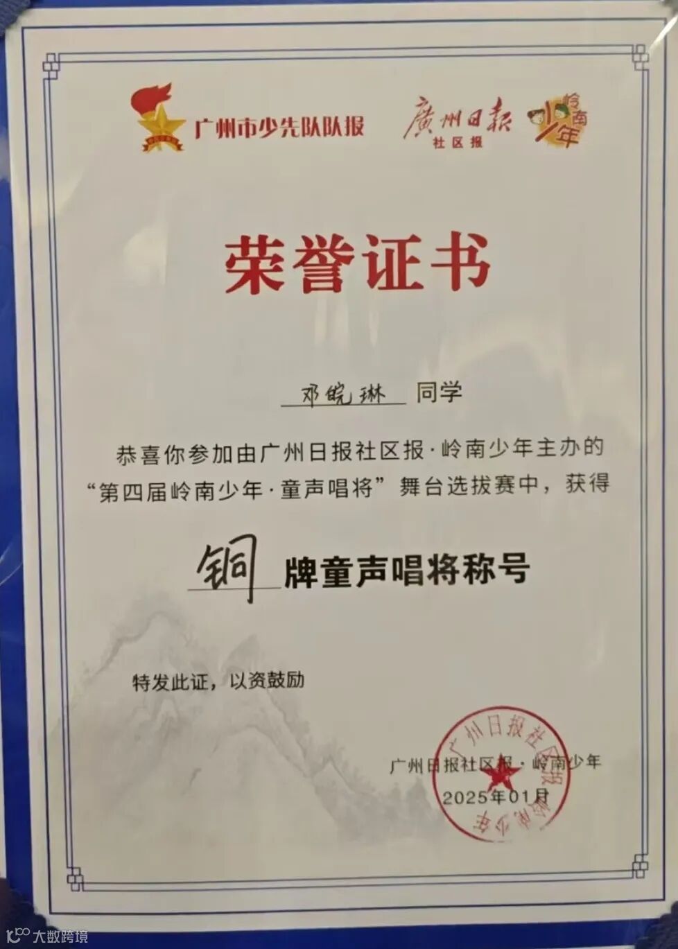 近日,中国船舶集团广州公司所属广船一幼萌娃邓皖琳小朋友,荣获广州日报社区报·岭南少年主办的“第四届岭南少年·童声唱将”舞台选拔赛幼儿组铜奖。