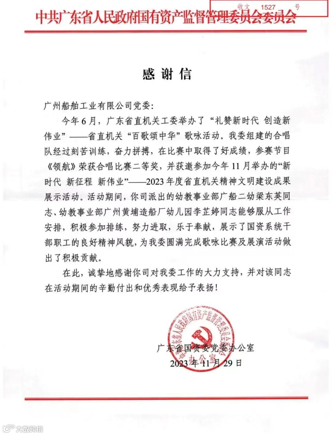 喜报|中国船舶集团广州公司收到广东省国资委感谢信