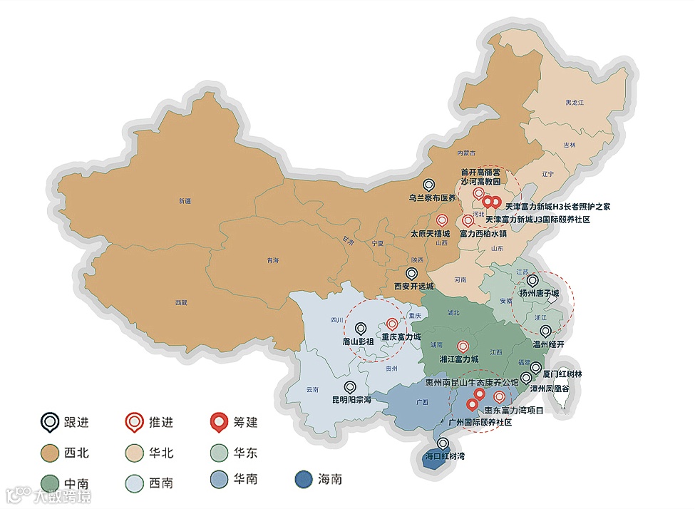 富力颐安致力于构建高端养老、旅居康养、康复护理等多业态于一体的大健康生态链。在未来3-5年内大力布局康养项目,实施三步走战略,首先深耕一线城市,其次逐步进入区域重点城市,最后达到全国布局。