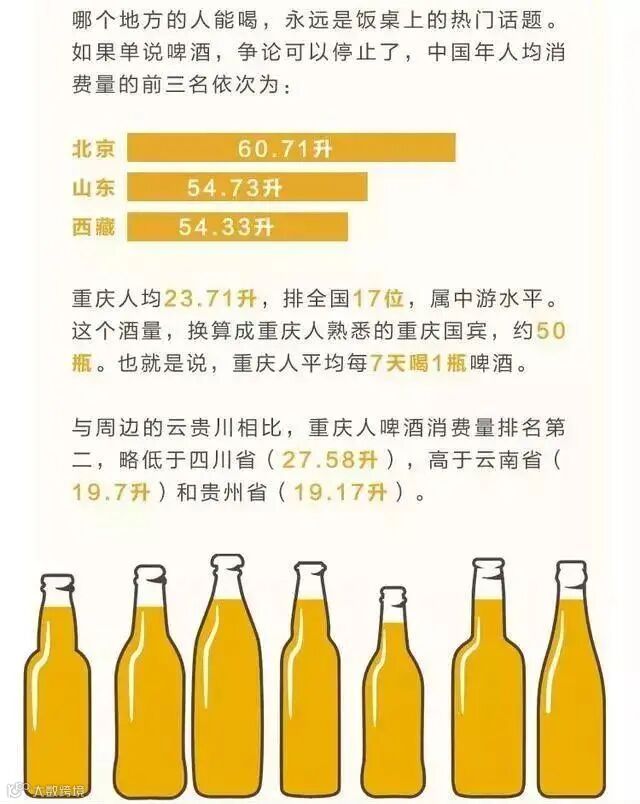 中国人均啤酒消费量为27.99升,高于全球平均水平;重庆人均啤酒消费量为23.71升,差不多50瓶啤酒,在全国排名17,处于中游水平。