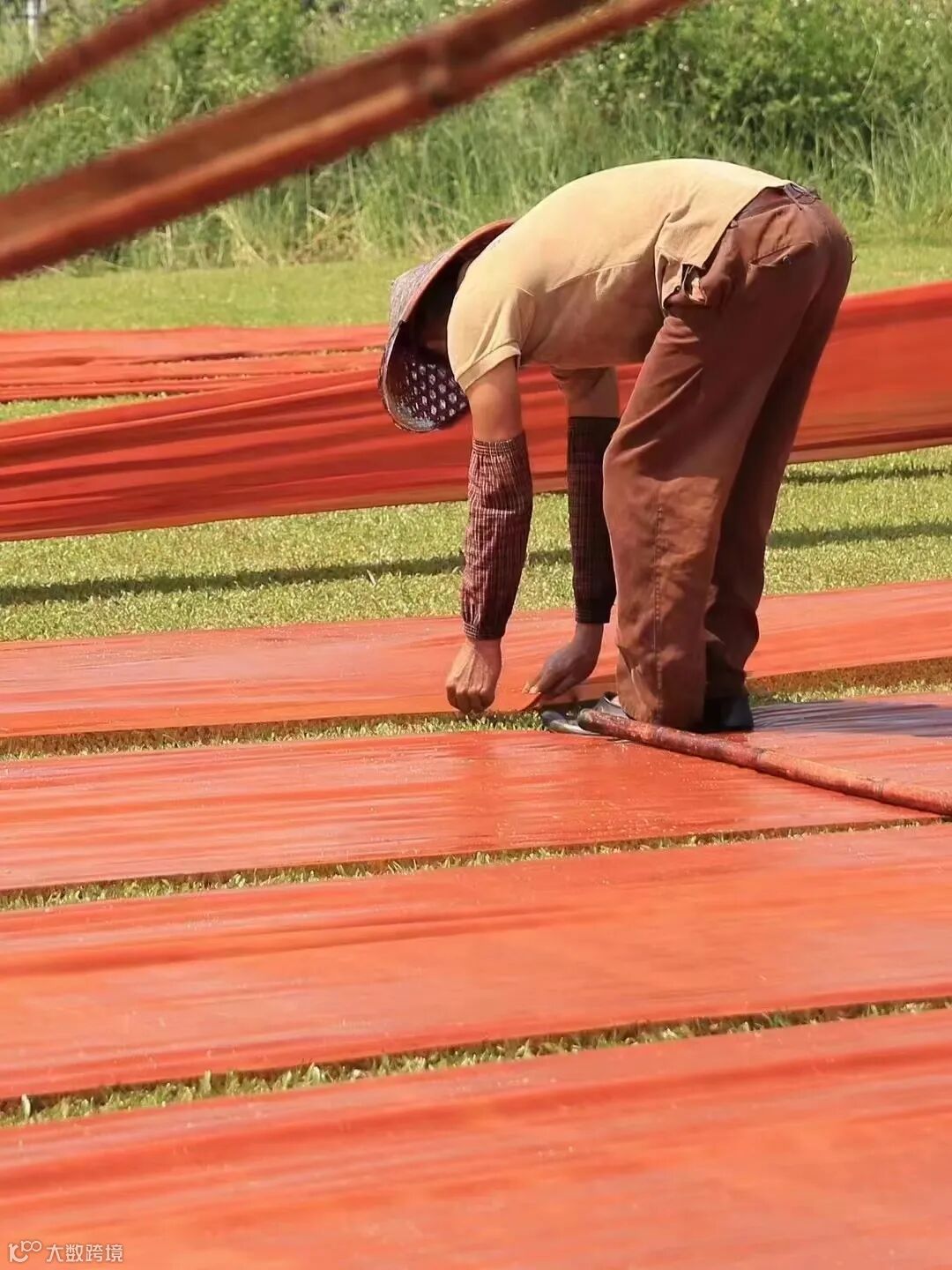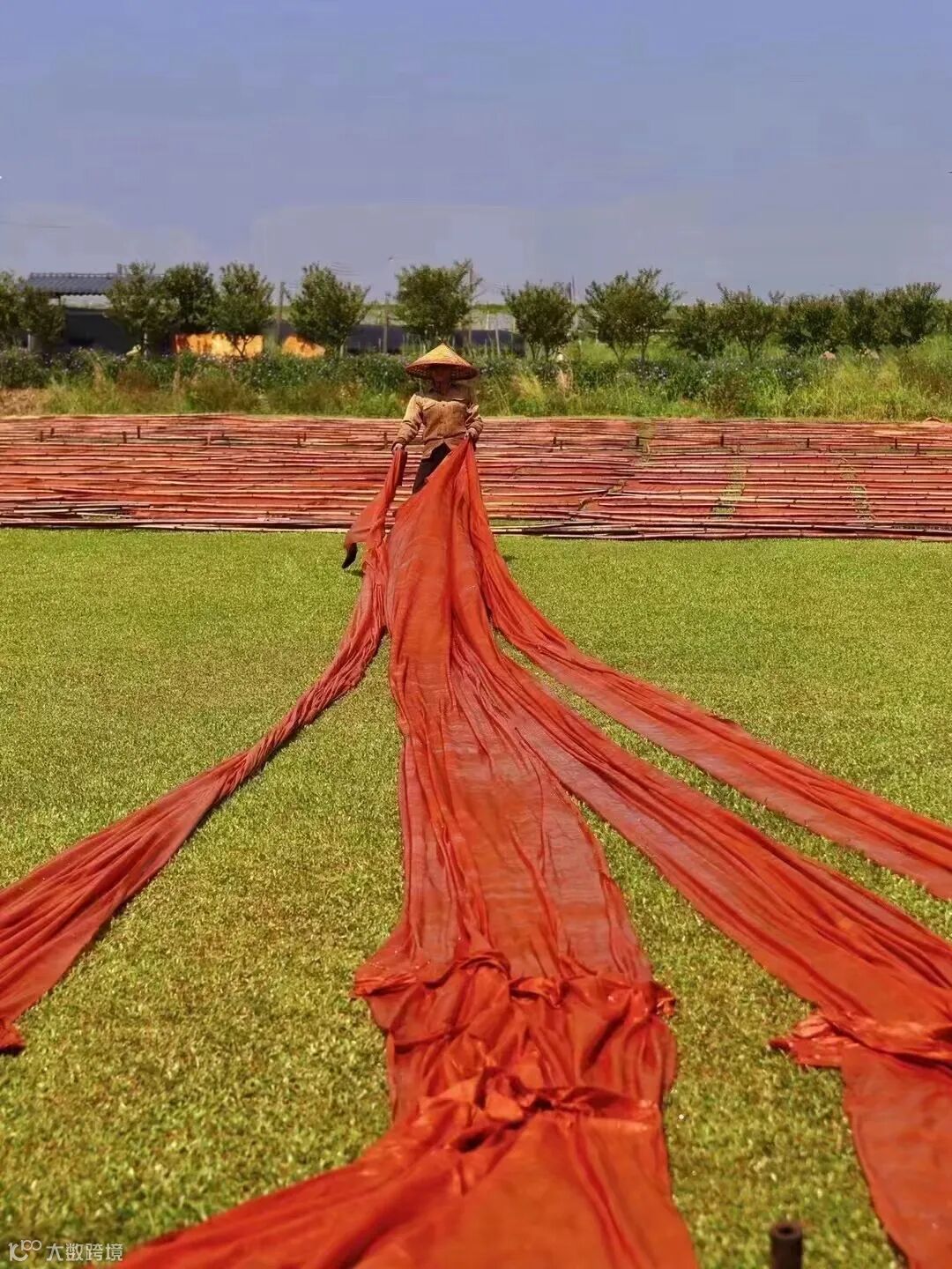 刚刚走进园区,就看到大片大片的绿色草地铺着烟霞色的香云纱,据说香云纱以蚕丝织品,用植物薯莨汁,经30多次浸泡染色,30多次阳光晾晒而成,所以要在阳光下翻晒很多次。