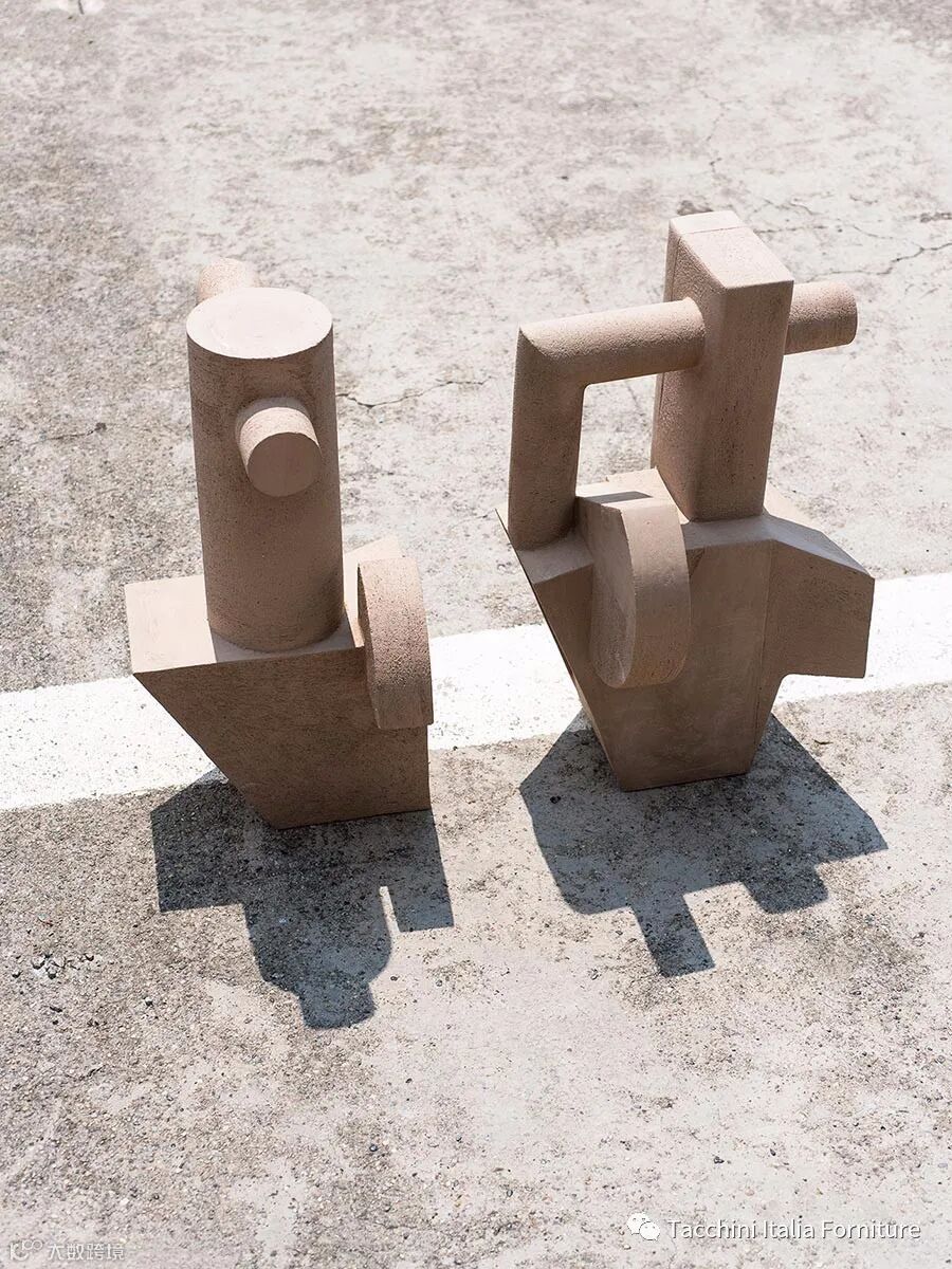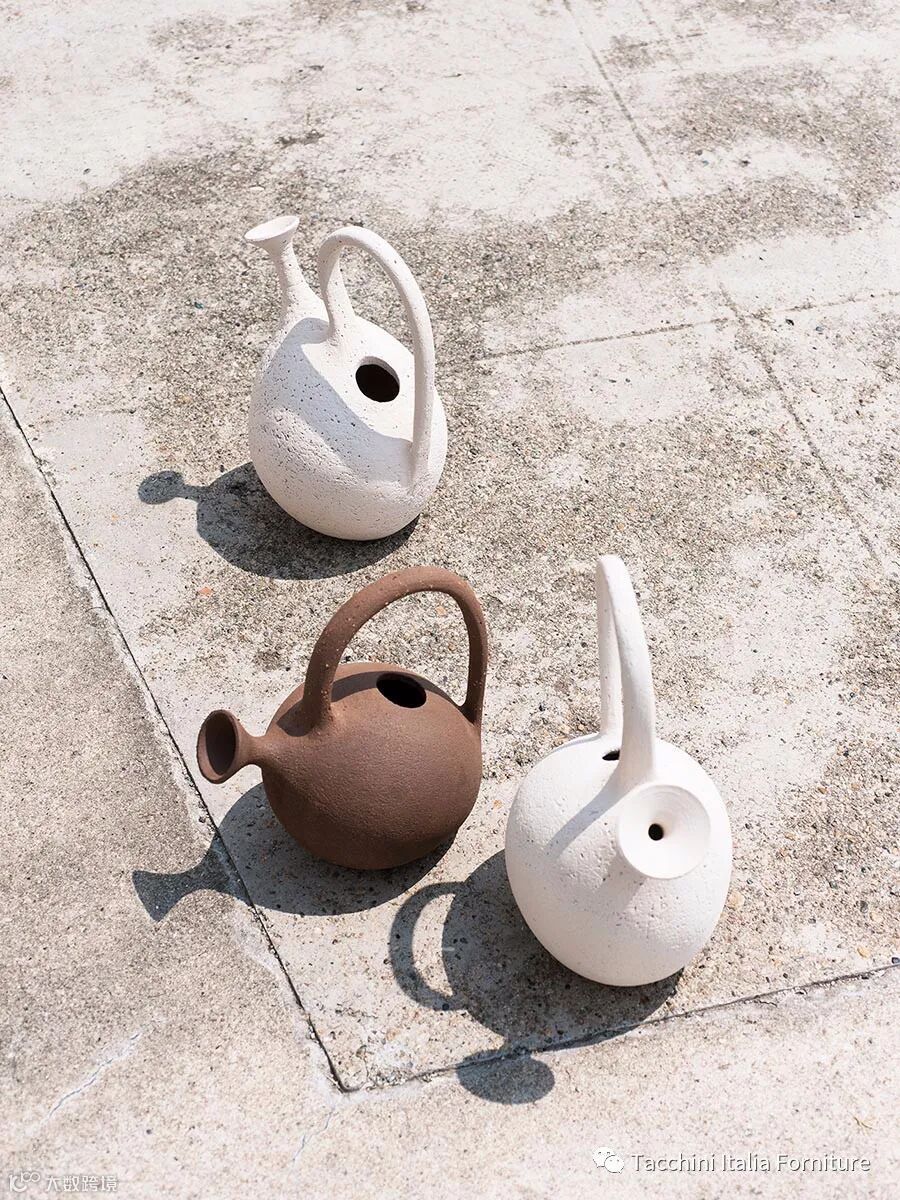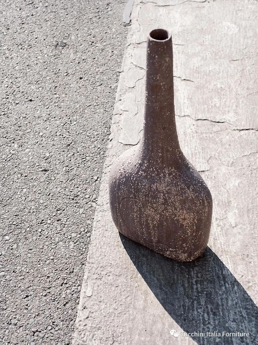 立体派画家Pablo 和Dora 的花瓶系列是向 Pablo Picasso 和 Dora Maar致敬,后者是他的缪斯女神。此系列使用线圈陶器技术制作,棕色雕刻的石制花瓶是重叠的几何形状,创造了一种深度和三维效果,可以根据观察者的视角而变化。 Aqua Regis amphora得名于一种有名的液体,这种液体因其溶解黄金的能力而被炼金术士命名。抛在陶工的轮子上,用镶嵌的半耐火材料制成,amphora系列是圆形结构,有一个大的横向把手和宽敞的脚垫。 这只高大的 Aurum花瓶的名字来自源拉丁语中黄金的意思,黄金代表着纯洁、价值和忠诚。 这个花瓶被命名为金星,以纪念长期以来与美丽和优雅的形状而著称的行星,它的圆形轮廓赞美女性气质,同时致敬古典雕塑的解剖学上的弯曲结构