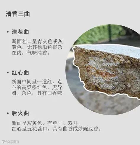 三者均采用大麦和豌豆作原料,制作过程基本相同,需经过九大关的历练:卧曲、上霉、晾霉、潮火、大火、后火、养曲、出房验收、贮曲等阶段,因在培养曲的过程中升温和降温情况不同,从而形成三种不同的酒曲:清茬曲小热大晾,红心曲中热小晾,后火曲大热中晾。