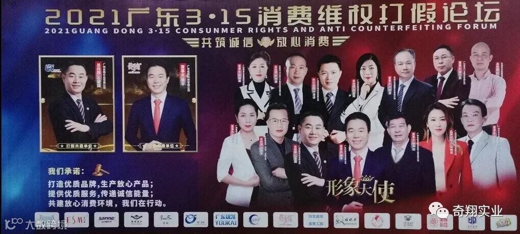 奇翔与20位优秀企业家代表参加了“广东3.15 消费维权打假论坛”自律宣言仪式,宣言内容:“打造优质品牌,生产放心产品;提供优质服务,传递诚信能量。共建放心消费环境,我们在行动。我承诺,维护消费者权益,由我做起”。