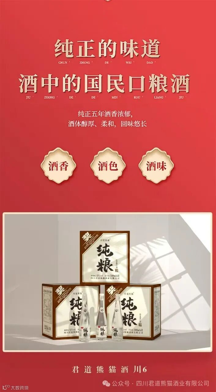 在包装上,君道熊猫酒同样别具一格。光瓶设计简洁大方,500g玻璃瓶身光滑细腻,质感十足。瓶身上的大熊猫图案可爱简约,不仅是四川的象征,更是中国文化的代表。这样的设计,无论是送礼还是自饮,都能彰显出品味与格调。作为一款浓香型白酒,君道熊猫酒在香气上也有着出色的表现。打开瓶盖,一股浓郁的酒香扑鼻而来,那是粮食发酵后的自然香气,让人沉醉其中。入口后,酒体醇厚而不失绵柔,粮香、窖香交织在一起,形成了独特的味觉体验。回味悠长,余香不断,让人忍不住再品一口。更为难得的是,在同价格酒中,君道熊猫酒具有显著的品质优势。它以实惠的价格,提供了远超同价位酒品的品质体验。这样的性价比,让更多人能够享受到这一品质卓越的美酒。