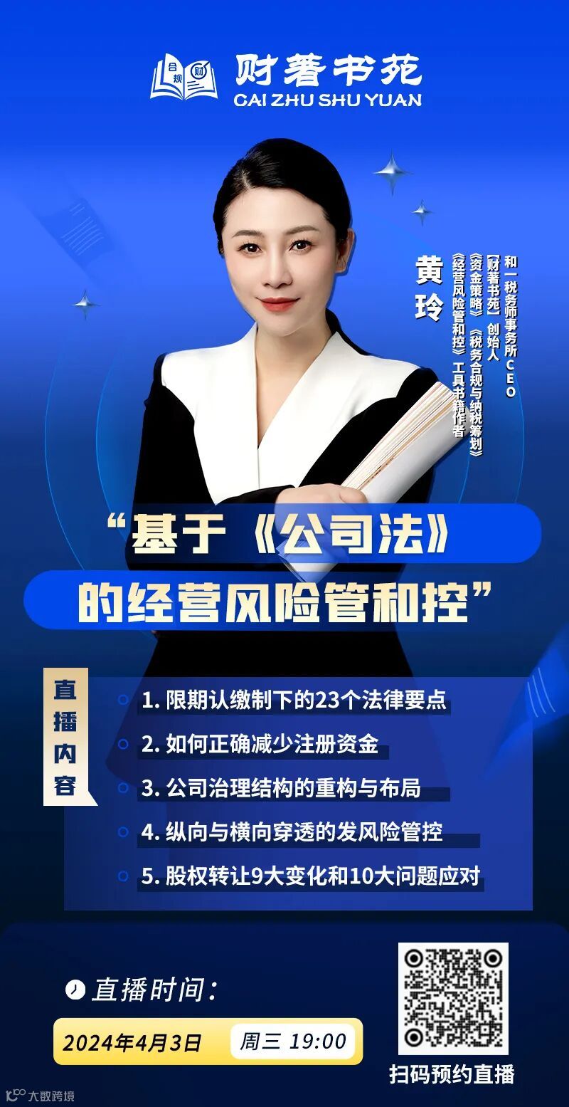 今晚19:00,黄玲老师将带来【基于《公司法》的经营风险管和控】的主播分享~