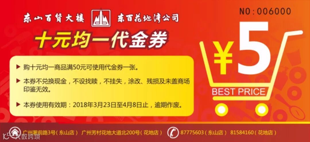 👍3月15日-3月22日,购床品、鞋满100元或在超市一次性购买正价商品满50元,送价值5元的"10元均一"代金券一张,单笔消费最多送10张(团购不参加该活动)