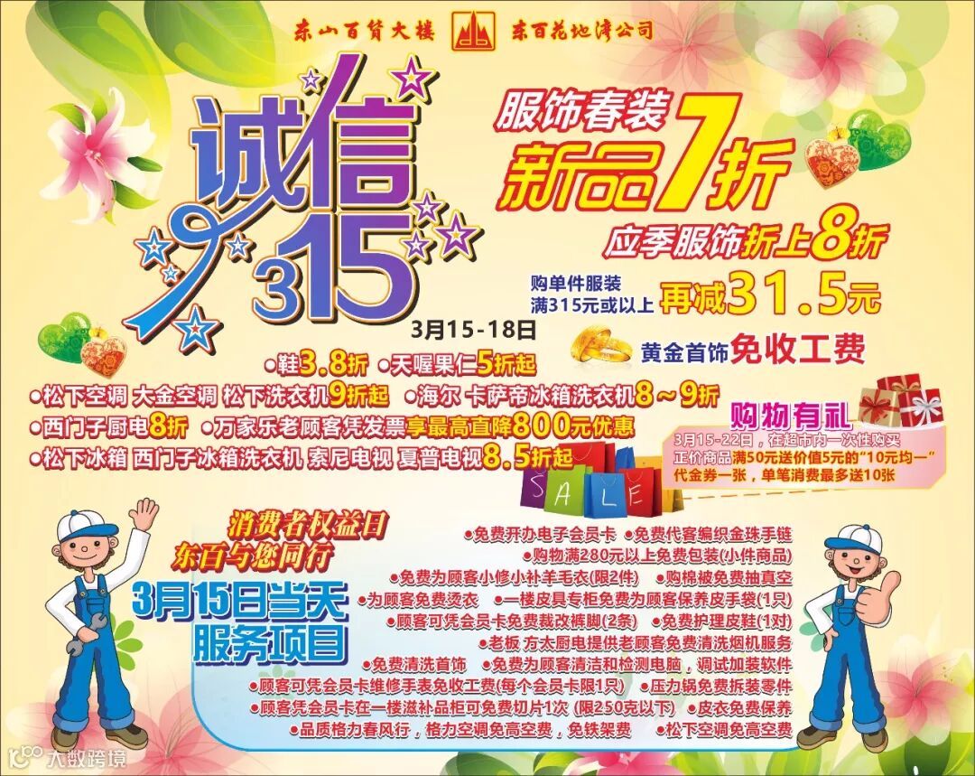 👍服饰春装新品7折,应季服饰折上8折,购单件服装满315元或以上再减31.5元