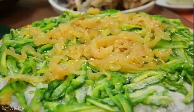 大顶苦瓜,顶大嘴尖,形如雷公凿,食时少苦带甜、爽脆,食后甘凉,富含人体极需的硒元素和维生素C,简直就是美容美体的佳品。冰镇苦瓜,最原始最简单的做法,最能体现苦瓜的甘味。对于苦瓜,中医认为苦瓜“除邪热,解劳乏,清心明目、清暑、益气、止渴