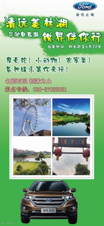 6月24日清远美林湖休闲之旅,火热招募!清远美林湖别墅度假村处于清远广州交界,是广州的后花园,这里风景宜人,摩天轮上可以鸟瞰整个美林湖,放眼望去一摊碧绿湖水,是大家休息之余最适合放松的地方,呼吸着大自然的新鲜空气,当然少不了当地农家菜助兴! 休闲游,让广州华驰福特陪您走起!