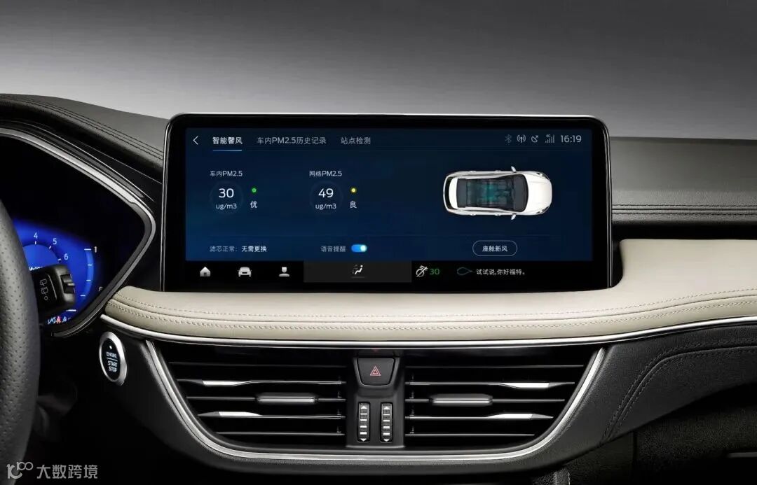 全新福特锐际中控大屏实时显示车内外的PM2.5数值