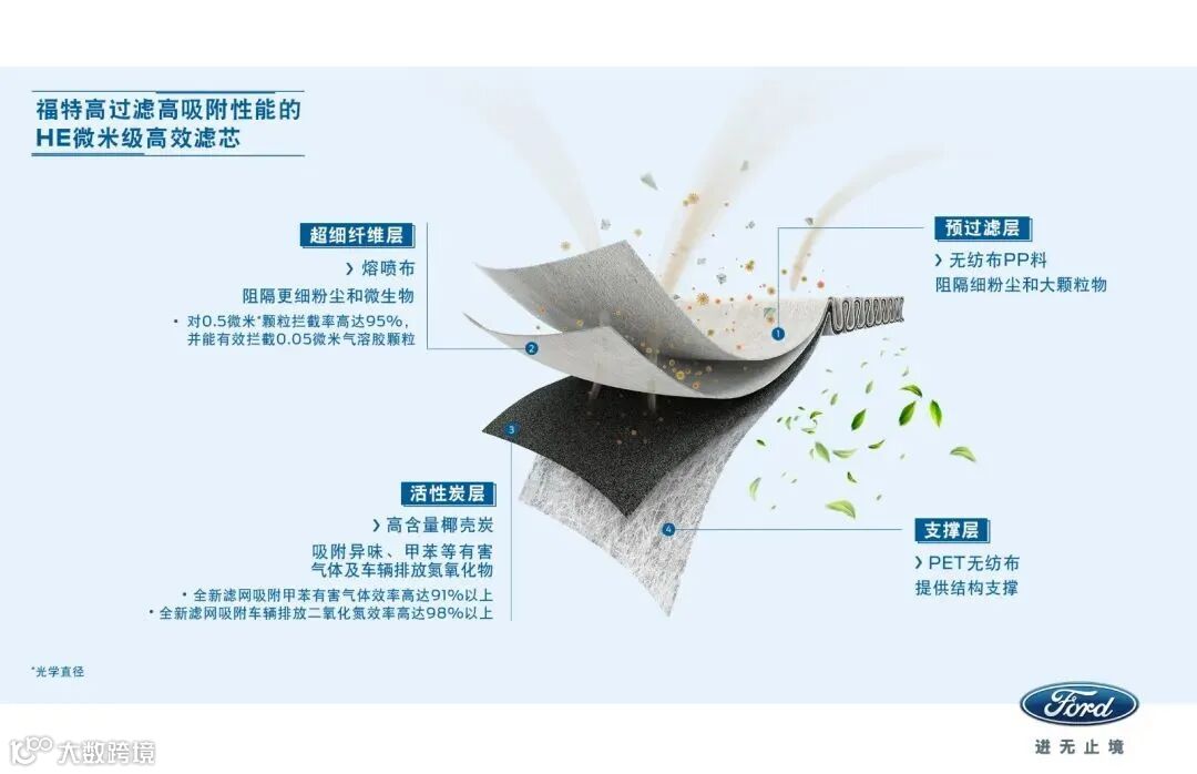 全能:福特HE微米级高效滤芯还在送风、过滤和吸附性能中间找到了科学的平衡点,对0.5微米5颗粒拦截效率达到95%以上,并能有效拦截0.05微米气溶胶颗粒。不仅拥有高效的过滤效能,也拥有优秀的吸附效能,能够吸附异味,并且全新滤网可吸附甲苯等有害气体效率高达91%以上,可吸附车辆排放二氧化氮效率高达98%以上。