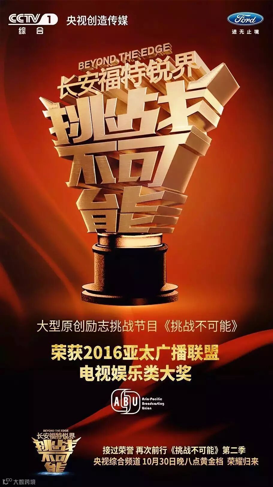 2016年10月30日起,由福特锐界独家冠名的大型励志挑战节目《挑战不可能》第二季,将在中央电视台综合频道(CCTV-1)每周日晚8点黄金档再度强势开播。央视著名主持人撒贝宁将与明星评委团董卿、王力宏、李昌钰一起,见证全球顶尖选手们完成难度再升级的全新挑战项目,助力他们挑战自我,超越不凡。