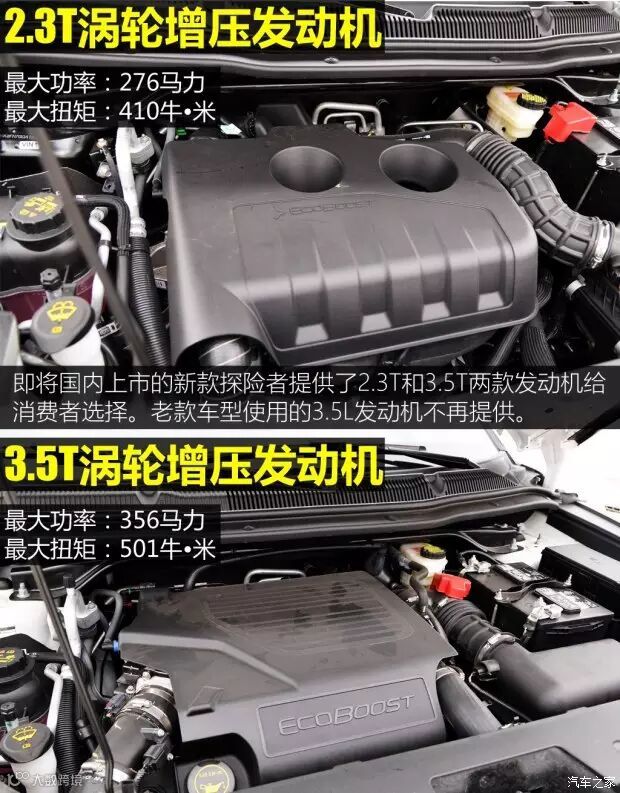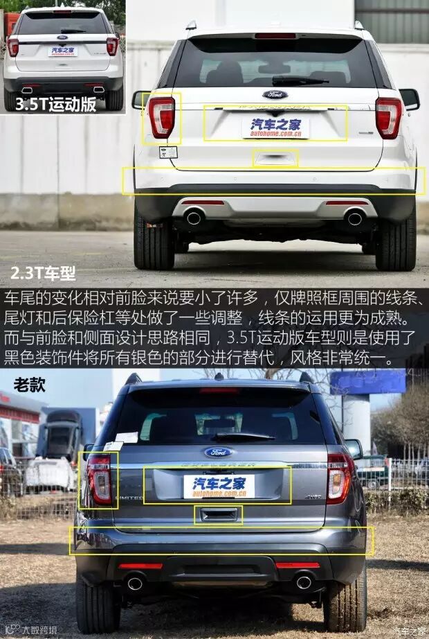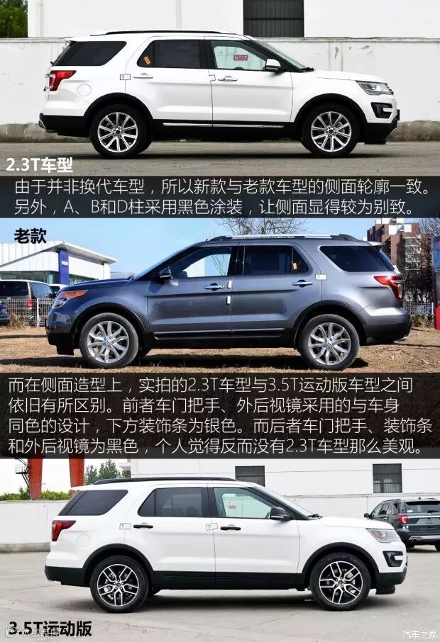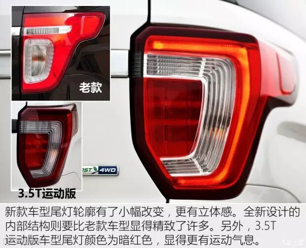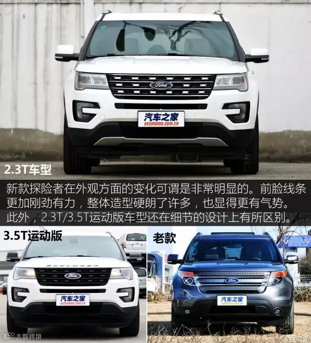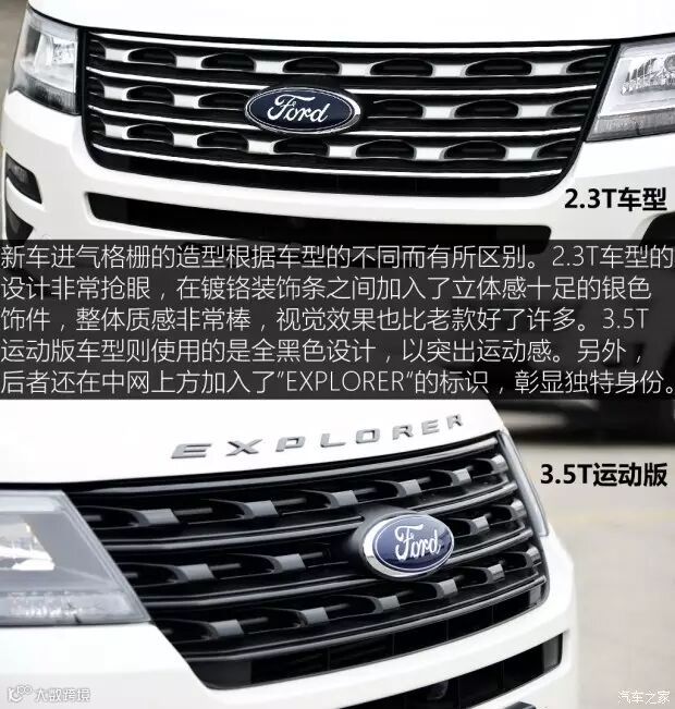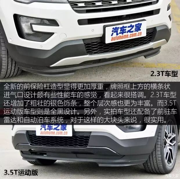 新款探险者外观方面在前脸方面有着较大的改变,相对来说其他方面的变化则相对较小。而另一大改变则是使用2.3T和3.5T发动机替代了3.5L发动机。此次我们实拍的车型为新款探险者2.3T精英版和3.5T运动版。