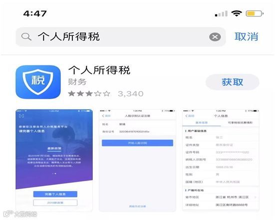方式一:打开App Store搜索功能,在搜索栏输入“个人所得税”,选择"个人所得税-国家税务总局”APP,点击“获取”。
