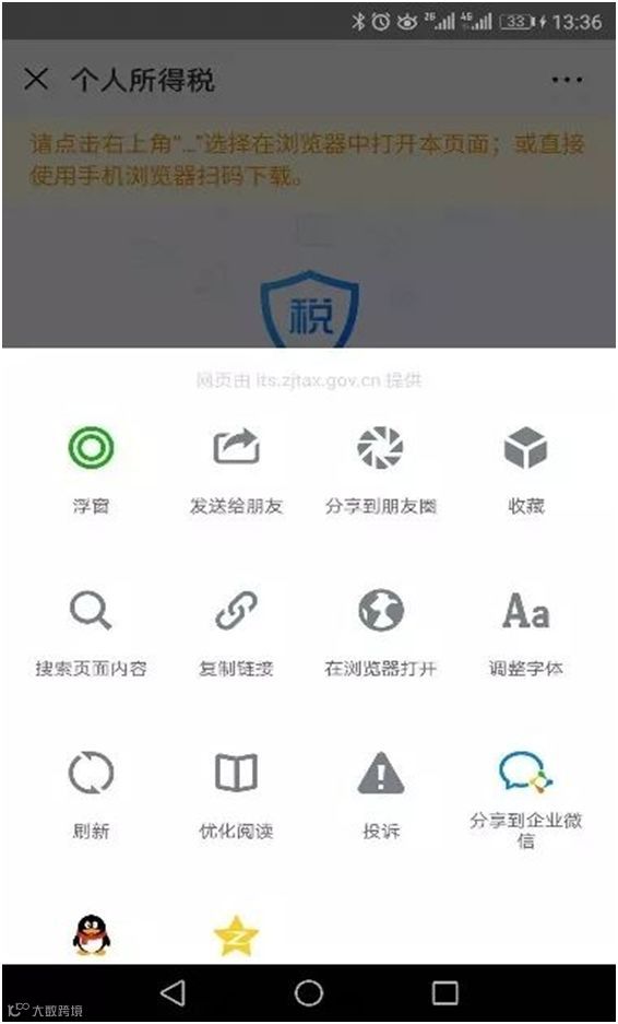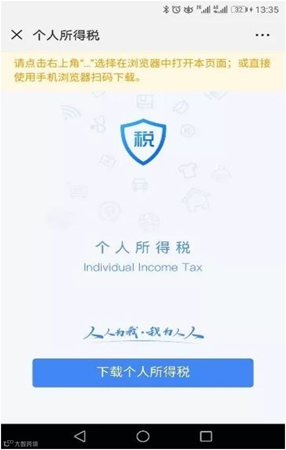 方式二:也可使用微信、QQ、支付宝、手机百度等APP扫一扫,可在扫描成功页面点右上角【…】按钮,选择“在(用)浏览器打开”进行个人所得税APP的下载。