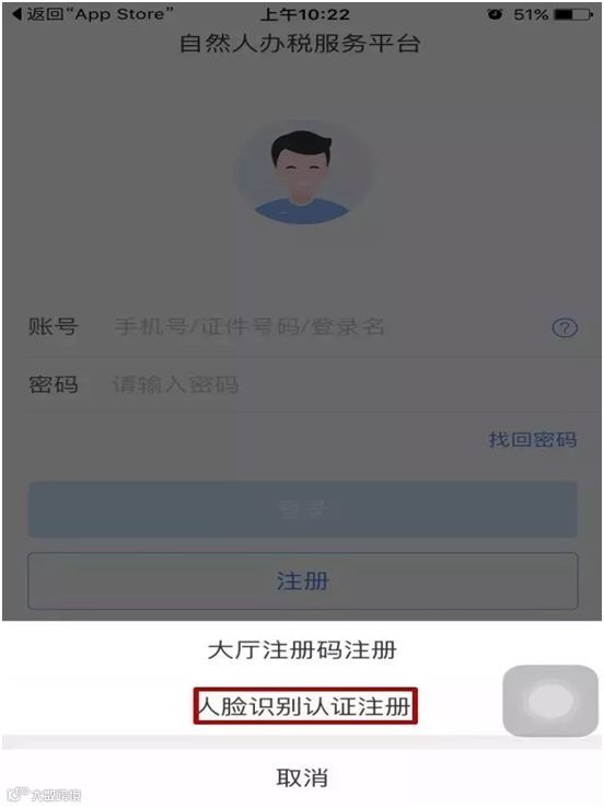 选择“人脸识别认证注册”,若选择“大厅注册码注册“需要纳税人携带有效身份证原件前往本地办税服务厅申请。