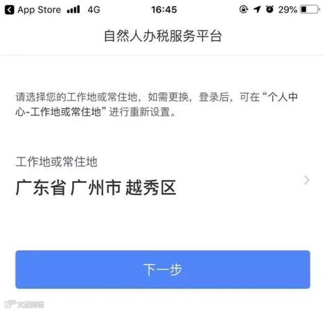 下载后,打开APP,工作地或常住地下拉列表选择“广东省XX市XX区(县)”,点击“下一步”。