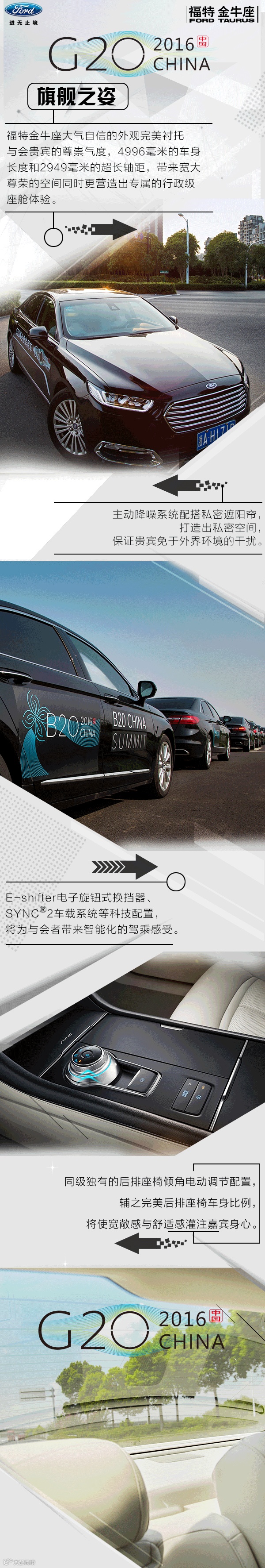 本次G20峰会,长安福特将提供福特金牛座EcoBoost® 245及EcoBoost® 325 V6车型,担负起礼宾用车以及新闻媒体用车。集福特全球资源与先进科技倾注而成,作为长安福特旗舰车型,福特金牛座将以由内而外的精湛品质和前瞻创新的智能科技配置,全力为与会贵宾打造舒适怡心的尊享体验,为各国与会要人带来尊崇礼遇。