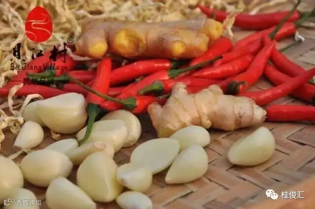 3.把晒好的干木瓜条洗干净,老姜、蒜打碎、上等生抽酱油、辣椒、食盐、白糖、陈醋、白酒、与木瓜条一起腌制。