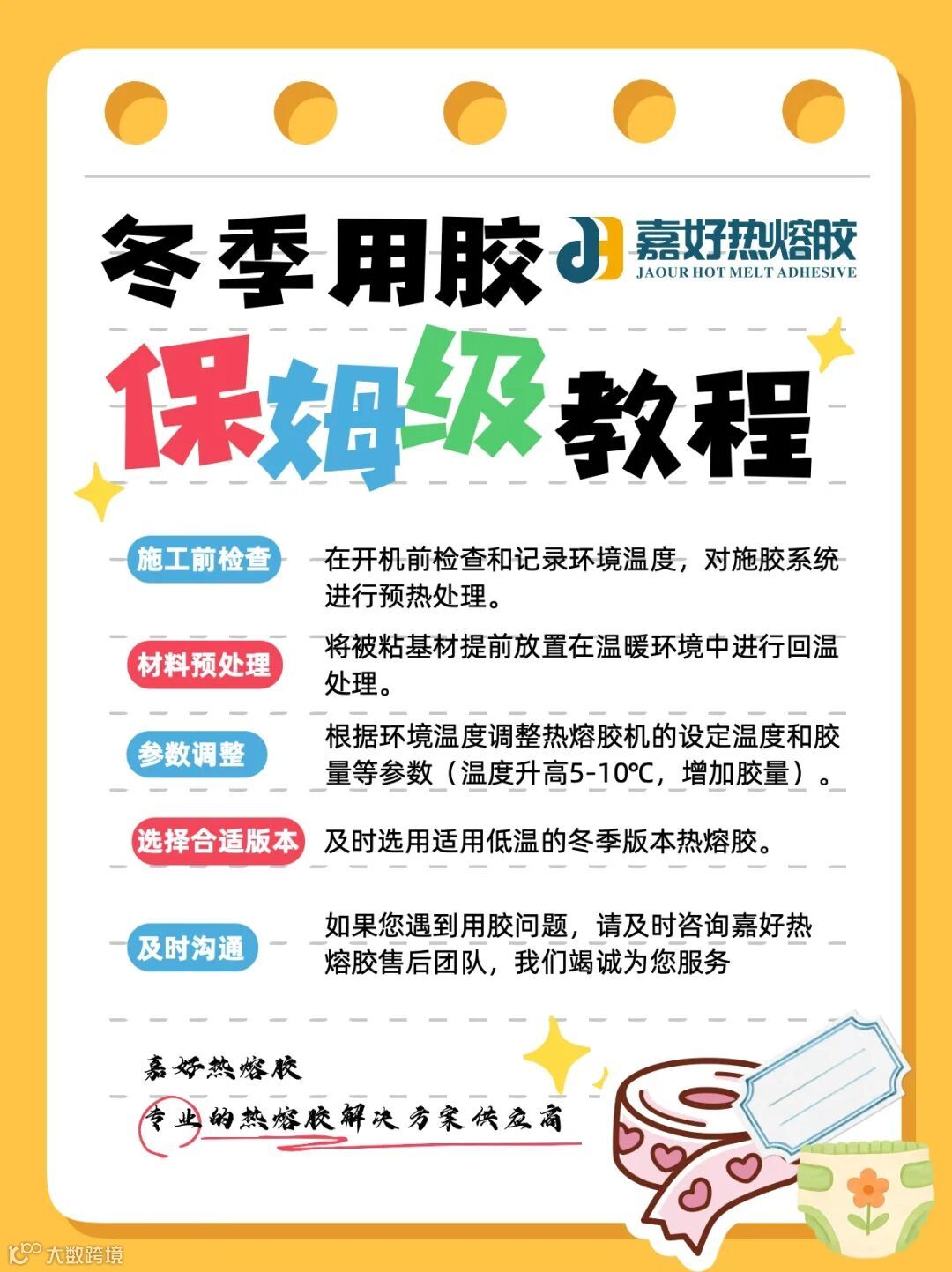 随着气温逐渐下降,许多使用热熔压敏胶的客户开始反馈胶粘效果不佳的问题。作为专业的热熔压敏胶解决方案供应商,嘉好深知冬季低温给生产工艺带来的挑战。本文将详细解释冬季热熔压敏胶性能下降的原因,并提供一系列实用解决方案,帮助您保持冬季生产质量的稳定性和一致性。