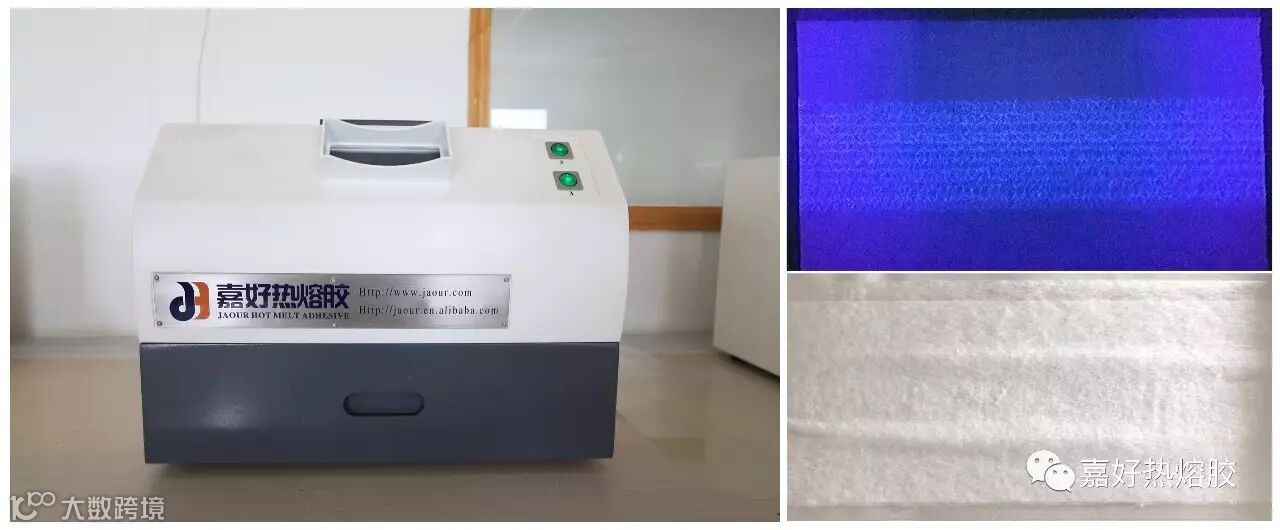 嘉好公司研发部的多功能高速实验涂布机,配备了Nordson的CF(大螺旋),Summit(小螺旋),Signature(纤维喷涂),TrueCoat(刮涂),SureWrap和V-slit 橡筋喷(刮)涂以及ITW-Dynatec Omega(Ω纤维喷)等,几乎满足卫生用品市场所有上胶方式的喷嘴,能很好的满足客户对生产工艺模拟的需求。嘉好公司可根据客户提供的基材,设计的上胶方式和胶量等要求,制备模拟客户生产产品局部工位的样品,并对样品进行测试,和对热熔压敏胶做出综合性能的评估,以向客户提供最佳的用胶方案。
