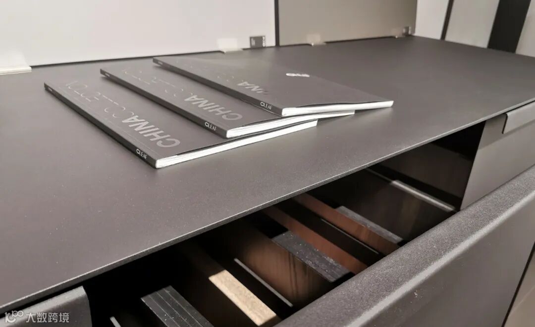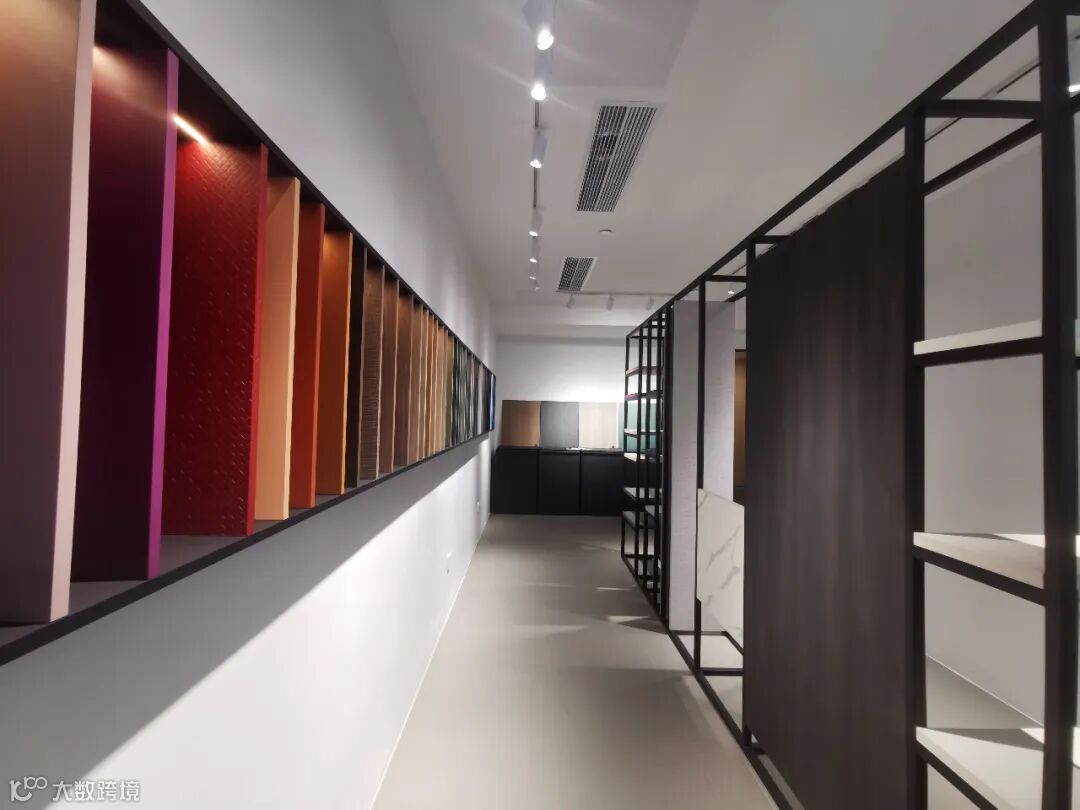 展厅内的另一件成品是进门两侧的样板展示柜,台面上摆放的是当下流行的CLEAF可丽芙花色。 更多的花色样品,我们通过抽拉式展示柜进行展示,在简洁的外观下,可谓是内有乾坤。