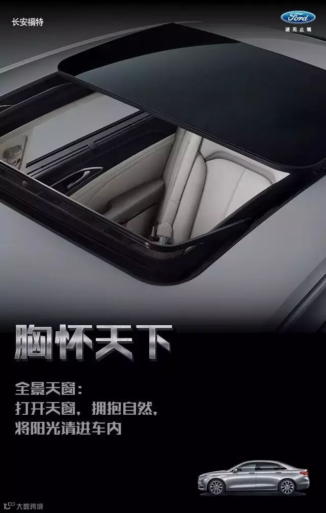 两片式全景天窗让空间感无限延伸,将大自然请进车内,与您共享愉悦心情,超静音设计及双开启模式,为驾乘者提供充足的新鲜空气及舒适的阳光享受,更显福特金牛座高雅、大气的设计风格。