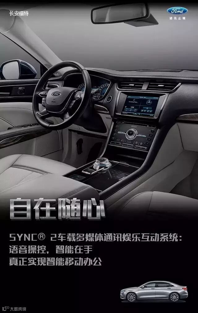 福特金牛座配备的SYNC® 2车载多媒体通讯娱乐互动系统,可以用语音拨打电话,语音播出短信内容,语音命令查阅电话簿等,能让您在驾车途中保持“双手不离方向盘,双眼不离前方路”,真正实现智能化移动办公。