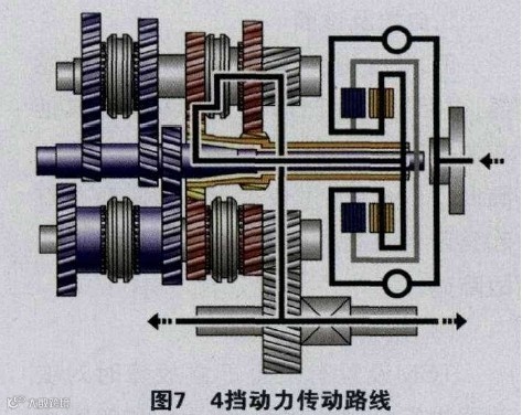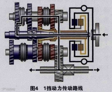 扭矩经离合器爪传递到双离合器,从双离合器经过离合器2传递到输入轴(空心轴)。输入轴将动力传递到输出轴(1~4挡)的4挡齿轮,经过输出齿轮传递到差速器。