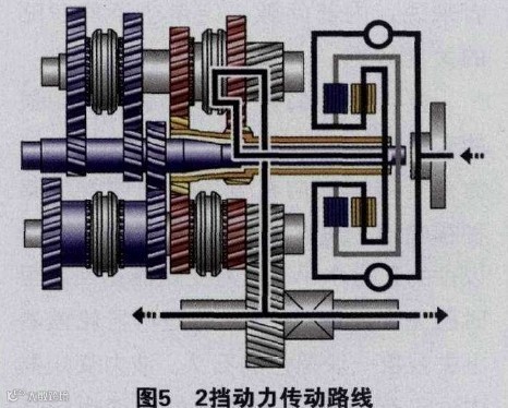 扭矩经离合器爪传递到双离合器,从双离合器经过离合器2传递到输入轴(空心轴),输入轴将动力传递到输出轴(5、6及倒挡)的6挡齿轮,经过输出齿轮传递到差速器。