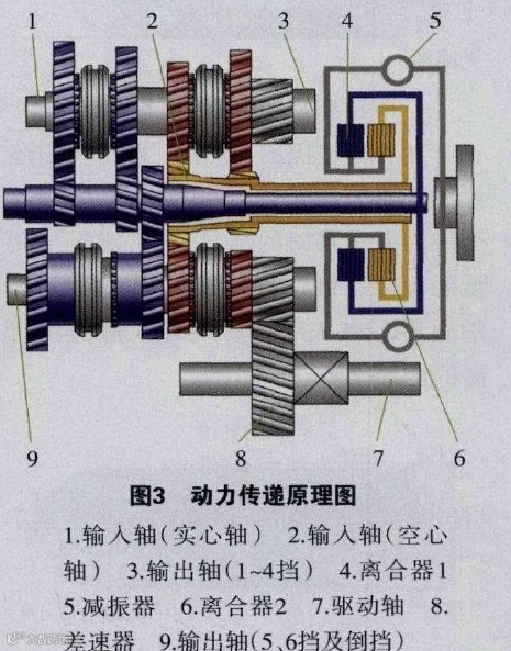 扭矩经离合器爪传递到双离合器,从双离合器经过离合器1传递到输入轴(实心轴)。输入轴将动力传递到输出轴(1~4挡)的3挡齿轮,经过输出齿轮传递到差速器。