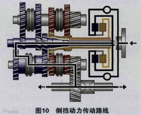 扭矩经离合器爪传递到双离合器,从双离合器经过离合器1传递到输入轴(实心轴),输入轴将动力传递到输出轴(5、6及倒挡)的倒挡齿轮。倒挡惰轮使得转动方向相反,动力经过输出齿轮传递到差速器。