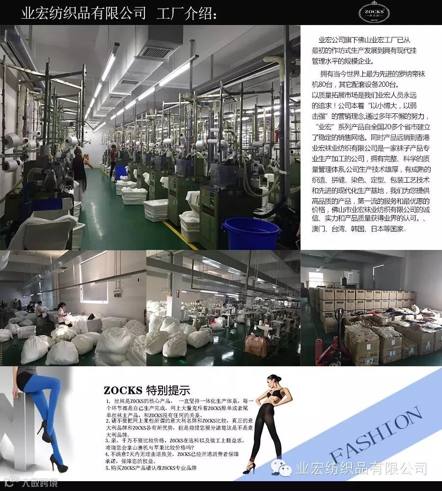 索克思袜业是一间集开发、设计、生产、销售于一体的新型企业。企业技术力量雄厚,拥有一批专业一流的制袜人才,公司工艺设备先进,拥有大型现代化生产厂房与当今世界一流的制袜设备,有世界先进水平的意大利全电脑丝袜机,及相关的配套设备 。