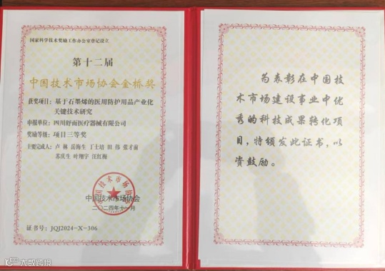 2024年12月12-14日,第十二届中国技术市场协会金桥奖励大会暨第十一届中国科技服务业论坛在北京友谊宾馆召开,四川舒而医疗器械有限公司申报的“基于石墨烯的医用防护用品产业化关键技术研究”项目荣获三等奖!