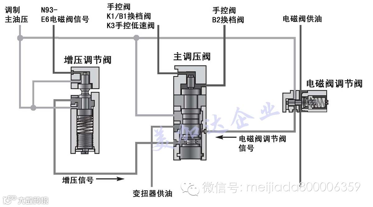 图中的电磁阀调节阀也值得引起重视。这个阀有两个作用,它控制着所有电磁阀的供油,如果该阀孔发生严重磨损而导致漏油,电磁阀的供油压力就会降低,还会影响到其他一些控制换档时间的阀,从而产生一系列的换档问题。另外,电磁阀调节阀对主油压的调节也起到一定作用。在图中可以看到它控制的电磁阀调节信号直接作用在主调压阀上,如果在电磁阀调节阀孔出现漏油,增压信号和主油压会从这里泄漏,引起基线平衡油压的降低,甚至没有主油压增压。