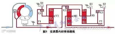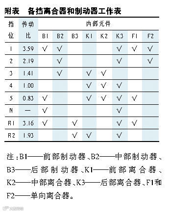由于维修资料中故障说明涉及面较广,同时涉及到的元件又有很多,而且用户反映变速器阀体已经在其他修理厂更换过,所以我们建议用户做变速器大修。从各挡离合器和制动器工作表(附表)中可以看出,在3挡时,离合器K1和K2工作,4挡时离合器K3也参加了工作,这点从变速器的4挡传动图(图1)中也可以看出。4挡时,离合器K1工作,前行星齿轮架V3和前太阳齿轮V1被锁定在一起,前行星齿轮组被锁止为整体转动。离合器K2工作并传递输入转速到后行星齿轮架H3,H3与前内齿圈V4同速转动,被锁定的后行星齿轮组同时和后行星架H3、中内齿圈M4连接,后行星齿轮组被锁止为整体转动。离合器K2传输输入转速到中内齿圈M4,离合器K3工作,将中太阳轮M3和后太阳轮H3连接在一起,中行星齿轮组被锁止为整体转动并实现传动比为1的输出。