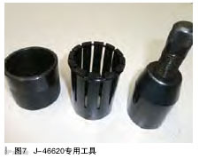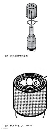 由于此款变速器无法订到大修包,各密封件只能逐个订购,第一次报件并没有报这4个油封环,只好再次重新订购。到货后,用J-46620系列专用工具(如图7所示,从左到右分别为J-46620-1、J-46620-2、J-46620-3) 安装。将专用工具J-46620-3置于输入轴支座上, 调整其螺栓使支座露出最下面一道油封环安装位置,将油封醮上变速器油放在专用工具J-46620-3的锥面上,用双手拇指和食指用力往下推油封环,将油封环撑大,直至油封环到专用工具J-46620-3的圆柱部分,这时用专用工具J-46620-2将油封环推到专用工具J-46620-3的下方(如图8所示),嵌入油封安装凹槽内。用同样的方法安装另外三道油封环。这时的油封环已经被撑得很大,甚至大于输入轴支座的直径。这时是不能用专用工具J-46620-1来使油封环就位的,也不能直接安装3-5-R挡离合器和4-5-6挡离合器总成,这样会切折油封环。而是要用透明胶布的背面(不能用有黏结成分的那面)接触油封环,逐步将油封环箍进安装凹槽(1-2圈是很难将其完全箍进去的,要多箍几圈)内。各油封环就位后,将其放进冰箱内冷却(温度要低于零摄氏度) 8 h左右,拆下油封环上的透明胶布,将油封环上涂上变速器油,使用专用工具J-46620-1,使其大倒角朝下,小倒角朝上,箍进输入轴支座(如图9所示),再使其小倒角朝下, 大倒角朝上, 箍进输入轴支座, 进一步使油封环安装就位。安装完毕,将3 - 5 - R挡离合器和4-5-6挡离合器总成装到输入轴支座上。将压缩空气施加到变速器壳体相应油孔,3 - 5 - R挡离合器和4-5-6挡离合器均能正常工作。