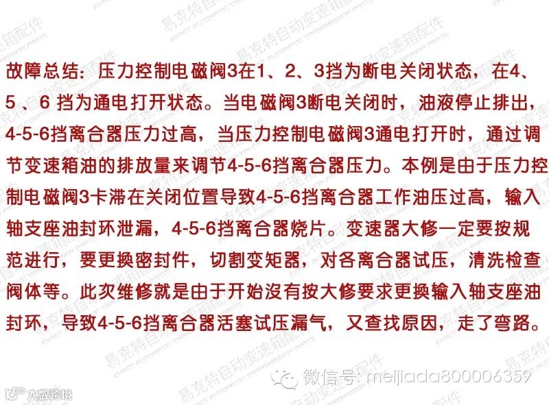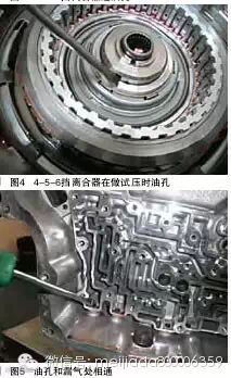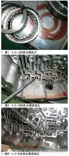 故障诊断:连接GDS+MDI,读取全车故障码,发现发动机控制模块有P0700:变速器控制模块故障(MIL)点亮请求;变速器控制模块有P0796:压力控制电磁阀3卡滞关闭。清码试车,变速器倒挡正常,1挡升2挡,2挡升3挡正常,但在变速器升入4挡后出现了如客户所述的现象,发动机突然负荷减小,转速上升。初步判断为离合器片打滑。结合故障码P0796,离合器压力控制电磁阀3调节低速挡、倒挡和4-5-6挡离合器油压,变速器控制模块根据变速器输入轴转速传感器数据和变速器输出轴转速传感器数据计算传动比,并将指令挡位的传动比和计算出的传动比做比较,当指令挡位为4挡、5挡或6挡时,比较的差值大于等于150r/min超过规定时间,会设置P0796。应是4-5-6挡离合器出现了打滑现象。着车挂P挡,当变速器油温升至80℃时从油位孔检查变速器油位正常,但变速器油有浓重的烧焦味道。决定拆解变速器。