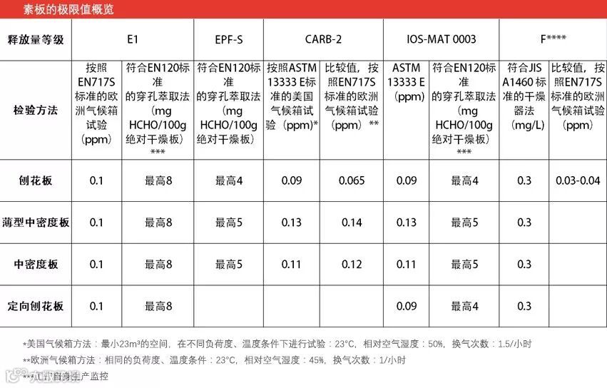 图为国际人造板甲醛释放限量标准素板的极限值一览表。从数值我们可以看出,F****标准甲醛排放量最小。