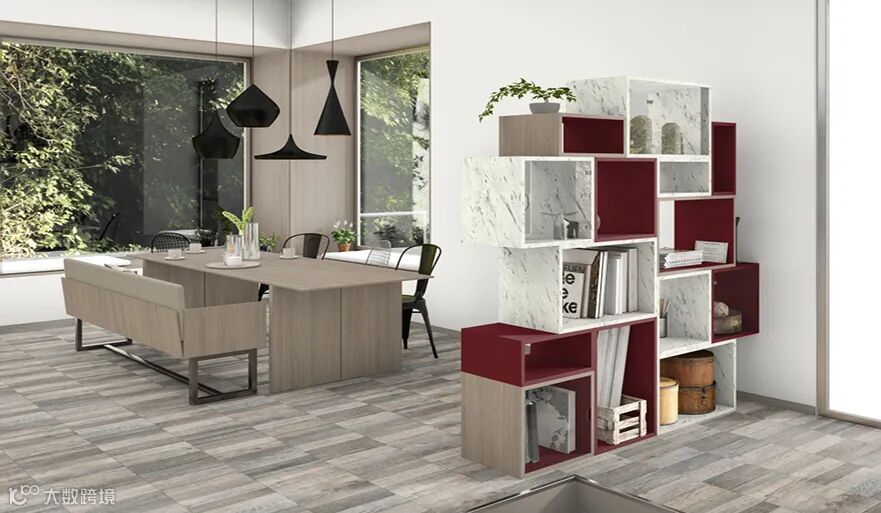 这款木纹花色适合与中性色调进行搭配,比如上图的灰色布纹、灰白色、铬金属银灰及熔岩色,在气质上有相近之处,非常适合用于现代简约风格室内空间中,自然素雅,柔和而温馨。