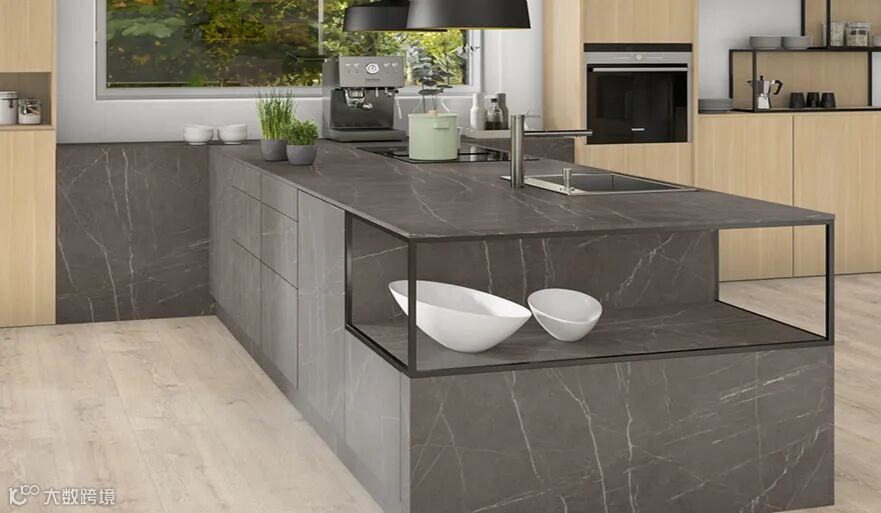 碳黑意大利石板XL超大规格减少了花色重复,比如在厨房空间中的大面积运用,看上去与石材无异,效果非常的逼真。这款花色具有偏暖的深灰色调,与白色调木纹搭配时会形成美好的对比,与近似色调的胡桃木等木纹花色搭配时显得极为优雅和尊贵。