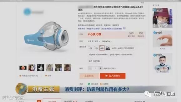 这款产品还打出了明星同款概念,宣称“防霾黑科技,大口深呼吸”,“PM2.5有效过滤率能大于91%”,“让您从此告别漏、勒、闷、丑、瞎、臭的种种困扰”。