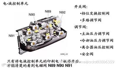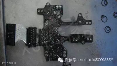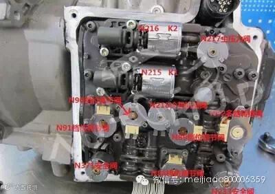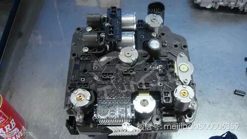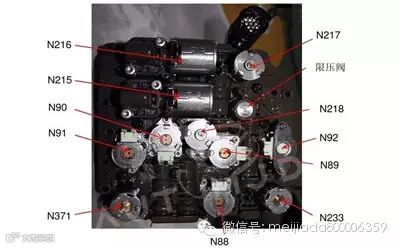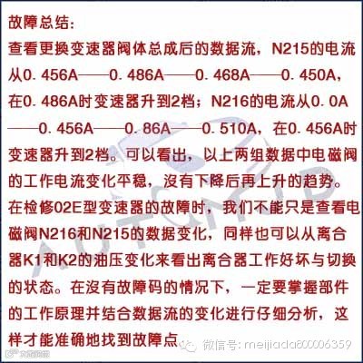 因为系统无故障码存储,于是决定查看数据流中是否能发现问题。在02E变速器中,变速器电磁阀N215控制离合器K1,电磁阀N216控制离合器K2 (K1离合器控制输入轴1与发动机的连接,K2离合器控制输入轴2与发动机的连接),电磁阀N217控制主油压。查看P档位的数据流,N215和N216的电流都是0A。将变速杆置入D位,同时踩住制动踏板,从D位的数据流可以看到N215的电流逐渐升高(0. 504A——0. 486A——0. 492A——0. 510A),在电流达到0. 492A时变速器升到2档;N216的电流逐渐升高(0. 00A——0. 00A——0. 456A——0. 506A) 、在电流达到0. 456A时变速器升到2档。观察G501和G502的数值都是0r/min ( G501监测输入轴1的转速,G502监测输入轴2的转速),抬起制动踏板,G501的数值从0r/min——60r/min——480r/min——600r/min——570r/min——640r/min,在600r/min时变速器升到2档;G502的数值从0r/min——60r/min——250r/min——320r/min——440r/min——510r/min,在320r/min时变速器升到2档。从以上数据可以看出,N215和G501的数据变化总是先上升再下降然后再上升,这种变化规律符合车辆在D位起步耸车的规律。分析可能的故障原因,包括:变速器阀体上的电磁阀N215损坏、电磁阀线束接触不良(线束的布置采用阀体上的电路板形式,不易损坏)以及变速器控制单元损坏(控制程序问题)。检查以上部件都需要拆开变速器阀体箱盖,所以首先检查电路板,结果电路板导通状况很好,没有问题。