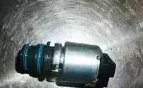 在前进挡2-3挡和4-5挡离合器压力控制电磁阀2同样也是由通电状态变为断电状态,由于在前进挡各挡位升降挡均未发现异常,可排除压力控制电磁阀2故障可能。在P、R、N挡和1挡手动位置压力控制电磁阀3状态没有变化,同样由于在前进挡各挡位升降挡均未发现异常,可排除压力控制电磁阀3,剩下也就换挡电磁阀了。将变速器控制模块和电磁阀总成从车上拆下,找到换挡电磁阀将其单独拆下来(如图1所示)直接连接1 2 V直流电压,发现无论通电和断电均处于关闭状态。
