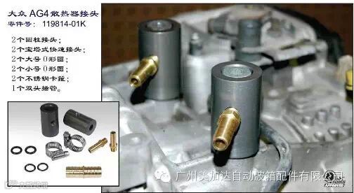 在拆卸原来的散热器时,主要要保留原来的散热器固定螺栓,我们只需要更换螺栓上旧的O形圈,螺栓将和新接头一起继续使用。在变速箱壳上连接散热器的两个埋头孔里的O形圈也需要更换成新的。