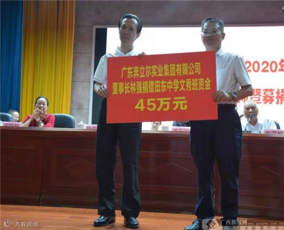 截至2020年,奔立尔集团已为各地教育系统,特别是衡阳各县市区的留守儿童和偏远贫困山区,捐赠校服及助学金累计金额超过500万元。其中,单为常宁、祁东、衡南等地,捐赠校服的数量超过1万套,累积金额超出100万元。捐赠活动多次获得了中国商报网、民进中央网、湖南教育新闻网、湖南政协网、衡阳市教育局官网等媒体的专题报道。“奔立尔”品牌已连续3年荣获中国品牌网评选前三名。集团董事长林强更是连续5年荣获衡阳市慈善排行榜个人榜单前十名,得到衡阳市委、市政府的高度肯定和社会各界人士的好评。2021年4月30日受到了湖南省委书记许达哲、省长毛伟民等领导的亲切接见和表彰,并被授予“湖南省脱贫攻坚先进个人”荣誉称号。