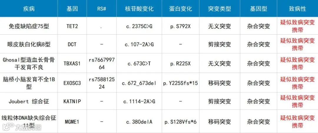 如上图,J女士还携带TET2、DCT、TBXAS1、EXOSC3、KATNIP、MGME1基因特定位点的杂合疑似致病突变,它们的遗传模式都是常染色体隐性遗传,因此对本人没有健康影响。根据遗传规律,该致病突变有50%的机率遗传给下一代,若夫妻双方共同携带的情况下,下一代则会有25%的概率可能患病。